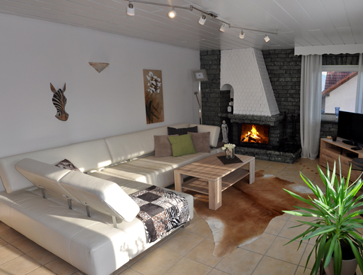 (Wohnzimmer mit offenem Kamin und SAT-TV)